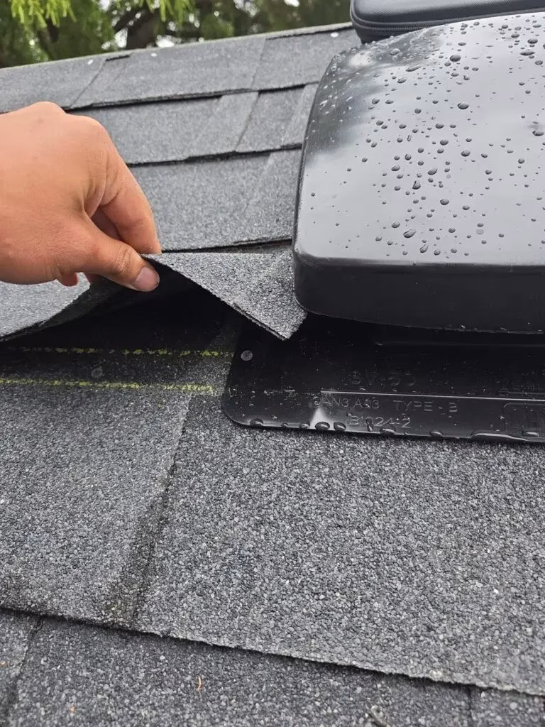 Flashing is the metal or waterproof material that goes around vents, chimneys, and skylights. Its job is to keep water out of the roof. Flashing can, however, still fracture, corrode, or come loose over time, causing holes that let water in and cause a roof leak.